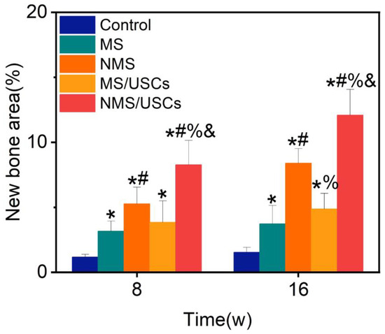 The new bone area of Masson staining results. * p < 0.05, compared with control, # p < 0.05, compared with MS, % p < 0.05, compared with NMS, & p < 0.05, compared with MS/USCs.