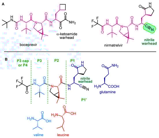 - Chia, C.S.B. Novel Nitrile Peptidomimetics for Treating COVID-19. Med. Chem. Lett. 2022, 13, 330–331. [Google Scholar] [CrossRef]