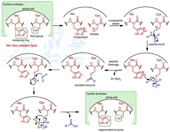 In some cysteine hydrolases, histidine and cysteine form a catalytic dyad in the active site; in such enzymes, the role of the third amino acid, Asp, is played by an activated water molecule (Scheme 1). In the first step of the enzyme’s catalytic mechanism, the imidazole ring of histidine as a base deprotonates the thiol group of cysteine, forming a thiolate–imidazolium ion pair. Next, the thiolate group performs a nucleophilic attack on the carbonyl C atom of the peptide bond of its substrate. As a result, the peptide bond is cleaved, the amine terminus of the peptide fragment (R-NH2) is released, while the acyl part forms a thioester with the cysteine, and the histidine is reestablished to its deprotonated form. Finally, the thioester bond of the acylated enzyme is hydrolyzed by an activated water molecule to generate a carboxylic acid group on the remaining substrate fragment (R’-COOH), regenerating the free enzyme.