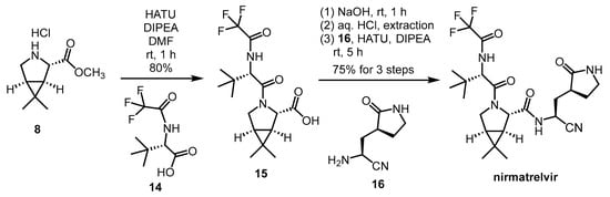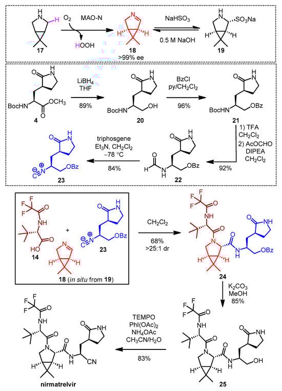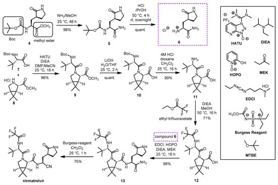 - Preschel, H.D.; Otte, R.T.; Zhuo, Y.; Ruscoe, R.E.; Burke, A.J.; Kellerhals, R.; Horst, B.; Hennig, S.; Janssen, E.; Green, A.P.; et al. Multicomponent Synthesis of the SARS-CoV-2 Main Protease Inhibitor Nirmatrelvir. J. Org. Chem. 2023, 88, 12565–12571. [Google Scholar] [CrossRef] [PubMed]