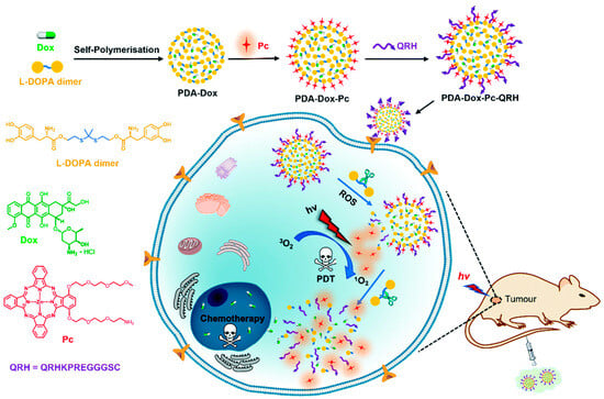 - Dai, G.; Chu, J.C.H.; Chan, C.K.W.; Choi, C.H.J.; Ng, D.K.P. Reactive oxygen species-responsive polydopamine nanoparticles for targeted and synergistic chemo and photodynamic anticancer therapy. Nanoscale 2021, 13, 15899–15915. [Google Scholar] [CrossRef] [PubMed]