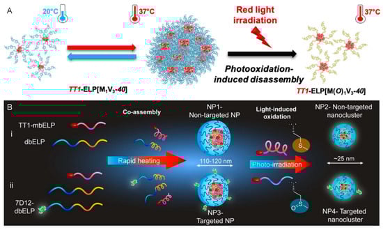 - Le, D.H.T.; Ibrahimova, V.; van den Wildenberg, S.A.H.; Wu, H.; Fonseca, A.; Torres, T.; Garanger, E.; Leenders, W.P.J.; Brock, R.; Lecommandoux, S.; et al. Light-Responsive Elastin-Like Peptide-Based Targeted Nanoparticles for Enhanced Spheroid Penetration. Angew. Chem. Int. Ed. 2023, 62, e202300511. [Google Scholar] [CrossRef] [PubMed]