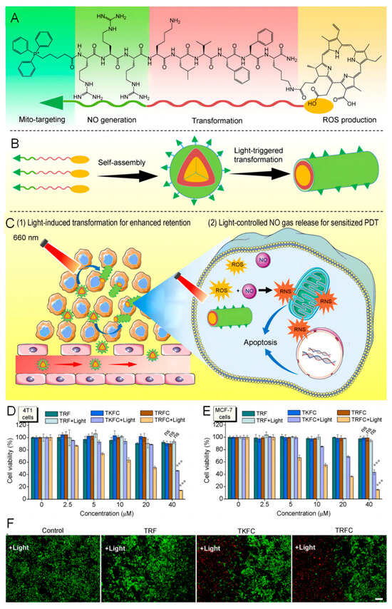 - Jiang, L.; Chen, D.; Jin, Z.; Xia, C.; Xu, Q.; Fan, M.; Dai, Y.; Liu, J.; Li, Y.; He, Q. Light-triggered nitric oxide release and structure transformation of peptide for enhanced intratumoral retention and sensitized photodynamic therapy. Bioact. Mater. 2022, 12, 303–313. [Google Scholar] [CrossRef] [PubMed]