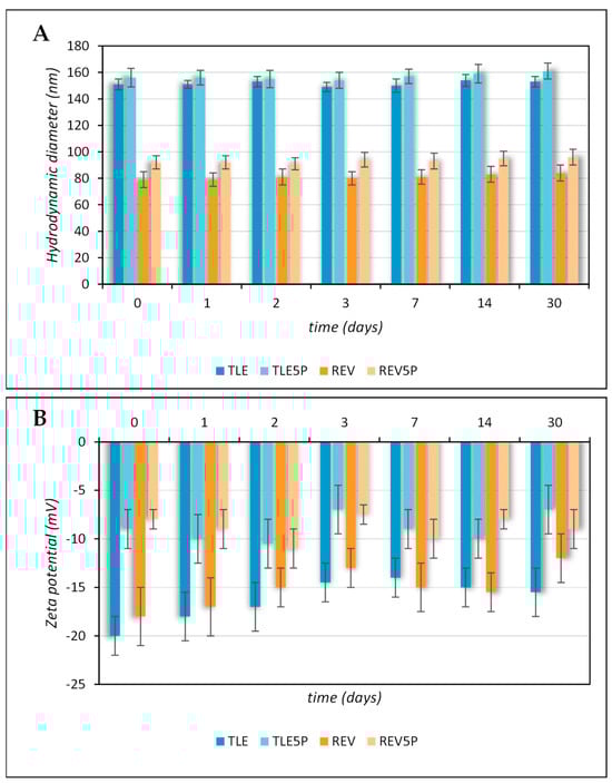 Colloidal stability of plain and pal-KTTKS-loaded liposomes obtained by TLE and REV and stored at 4 °C. (A) Hydrodynamic diameter; (B) zeta potential.