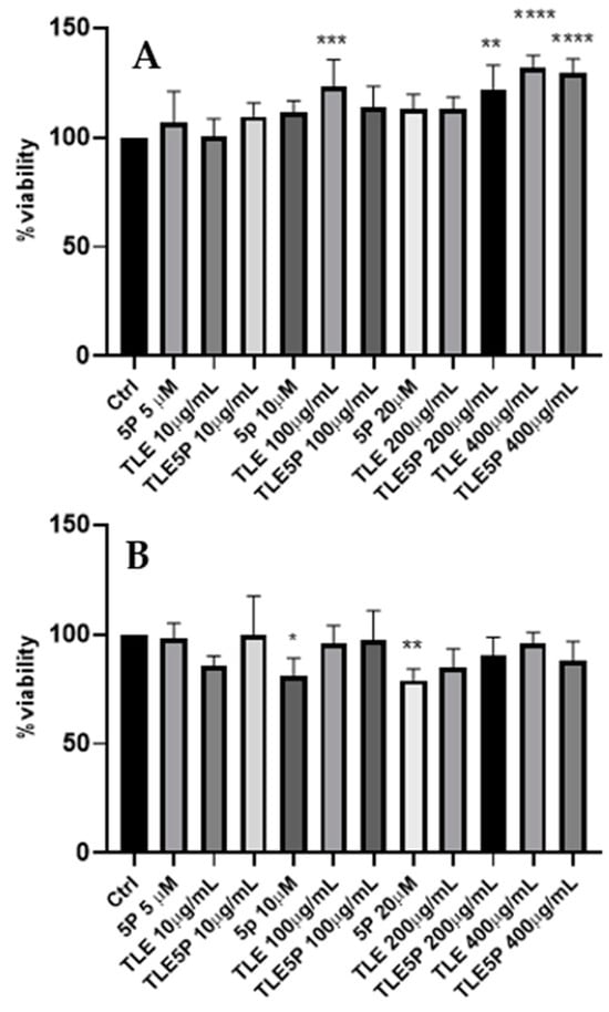 MTS cytotoxicity assay. Ctrl: control. For the other acronyms, refer to the Section 2. (A): 3T3-NIH cells after 24 h of treatment. (B): cells after 48 h of treatment. All data are represented as the mean (SD) (* p < 0.05, ** p < 0.01, *** p < 0.001, **** p < 0.0001).