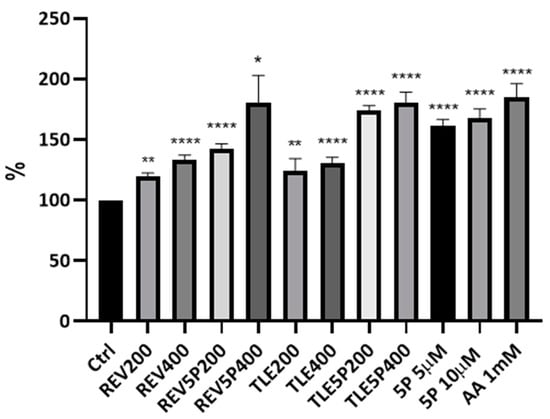 Collagen production by NIH-3T3 fibroblasts upon treatment with liposomes and loaded-liposome preparations. The Sirius Red colorimetric assay was carried out using a microplate reader with filters set at 560 nm. Results are percentages with respect to the Ctrl (control) (considered as 100%). For the other acronyms, refer to the Material and Methods section. AA: ascorbic acid; 5P: palmitoyl-pentapeptide. All data are represented as the mean (SD) (* p < 0.05, ** p < 0.01, **** p < 0.0001).