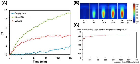 Observation of photothermal effect and triggered drug release. We documented a time-dependent photothermal effect: (A) the use of 780 nm light facilitated thermal effects on Lipo-ICGs. For comparison, a vehicle and an empty tube were utilized. A notable rise in temperature was seen within the Lipo-ICG group. (B) Temperature imaging demonstrated a heat map where the centrifuge tube’s temperature escalated to 42.8 degrees Celsius after being irradiated for a period of 14 min. This temperature increase subsequently triggered the release of the Lipo-ICG drug. (C) Shortly after the application of the 780 nm irradiation, the molecular form of ICG became detectable.