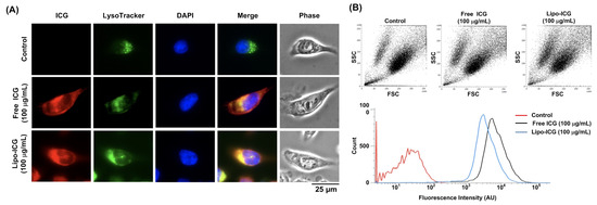 SAS-LN cells were seeded into an 8-well chamber slide (Nunc Lab-Tek, Thermo Fisher Scientific), 5 × 104 cells/well, and 100 μg/mL of Lipo-ICGs or free ICG was added to the chamber slide and incubated for 4 h at 37 °C and 5% CO2. The concentration of the Lipo-ICGs used in the experiments was calculated based on the amount of ICG encapsulated in the liposomes. The SAS-LN cells were cultured in a growth medium consisting of DMEM, a high glucose concentration (Gibco 11965, Thermo Fisher Scientific), a GlutaMAX supplement (35050061, Thermo Fisher Scientific), and 10% Fetal Bovine Serum (FBS) (Gibco 10082, Thermo Fisher Scientific). After treating the drugs for 4 h, we replaced the ICG-containing medium with a normal growth medium and then performed fluorescent microscopy imaging (DMi8, Leica Microsystems, Wetzlar, Germany). The SAS-LN cell line, the lymph node metastases oral cancer cell line, was gifted by Jeng-Woei Lee’s lab, department of Biomedical Sciences and Engineering, Tzu-Chi University, Hualien, Taiwan. The cell line was derived from the oral cancer cell line SAS with a potentiation of its lymph node metastatic capability [15]. In order to observe the cellular uptake of the liposomes into the cells, a cell-permeable fluorescence dye, LysoTracker (L7528, Invitrogen LysoTracker Red DND-99, Thermo Fisher Scientific), at a concentration of 50 nM, was used to stain the organelles within the cells for 30 min at 37 °C, following the protocols suggested by the manufacturer.