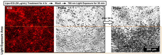 In addition, in order to test the PDT effect in vitro, the SAS-LN cell line was cultured in a 25T flask and treated with the Lipo-ICGs. Subsequently, half of the flask was exposed to a 780 nm light source generated by a high-power light-emitting photodiode (LED) (M780LP1, Thorlabs, Inc., Newton, NJ, USA) with a power of 300 mW for 30 min before being replenished with a normal growth medium to allow for a 24 h recovery period.