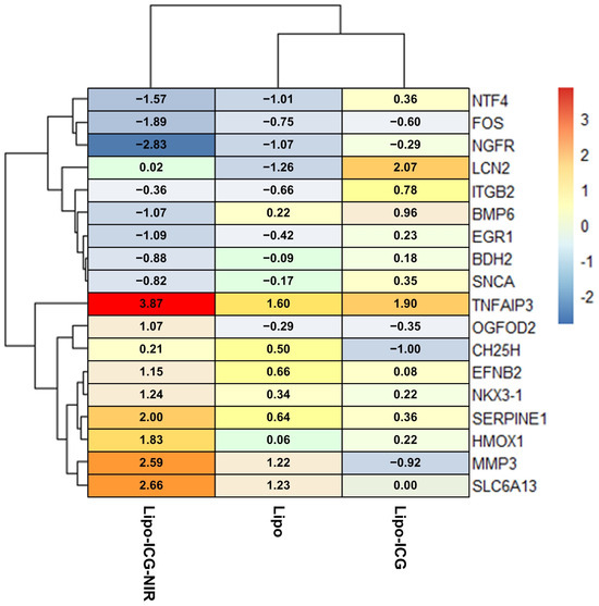 The heatmap data delineated two primary clusters, corresponding to genes with overexpression and underexpression. Upon comparing the Lipo-ICG-NIR group with both the Lipo and Lipo-ICG groups, distinct patterns of gene expression were observed. The RNA sequences for TNFAIP3, OGFOD2, CH25H, EFNB2, NKX3-1, SERPINE1, HMOX-1, MMP3, and SLC6A13 exhibited overexpression in the Lipo-ICG-NIR group. Conversely, the genes NGFR, FOS, NTF4, LCN2, ITGB2, BMP6, EGR1, BDH2, and SNCA were characterized by underexpression in the same group (Figure 6).