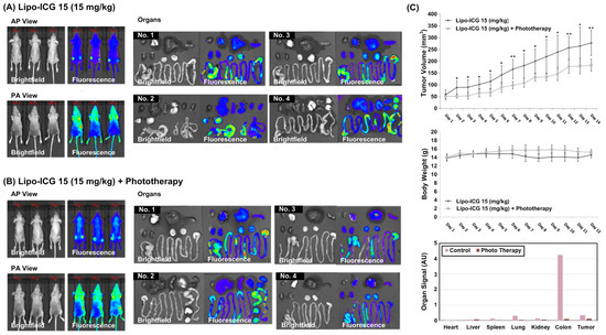 In vivo tumor growth suppression after photodynamic therapy. Oral cancer xenografts were established by bilateral flank injection of SAS-LN cells, and we used IVIS images for in vivo and ex vivo imaging. (A,B) The tumor xenografts could be imaged before the 780 nm laser irradiation, indicating the efficiency of Lipo-ICG delivery. The ex vivo IVIS imaging shows most of the ICG signals are detected in the colon, but there are still considerable fluorescent signals in the tumor xenograft. We measured tumor volume curves as illustrated. (AP: Posterior Anterior; PA: Anterior Posterior). (C) There was a slower growth rate in the 780 nm light treatment group than in the no irradiation group. The body weight curves showed no significant difference between the light treatment and no light treatment groups. Data are presented as mean ± standard deviation (n = 4). (*: p < 0.05; **: p < 0.01).
