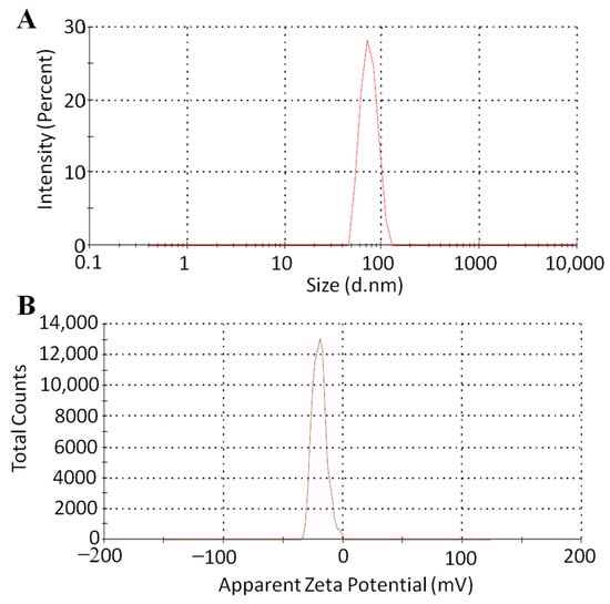 Particle size and polydispersity index (PDI) were measured by diluting specimens in a polystyrene cuvette using double-distilled water [16]. Dynamic light scattering (DLS) was used to measure the samples at a temperature of 25 °C and with a scattering angle of 90° using a Beckman Coulter N5 Particle Size Analyzer (Beckman, Brea, CA, USA). In order to describe the size distribution, PDI was also measured. The particles’ zeta potential was measured at 25 °C using a Zetasizer (Malvern Instrument Ltd., Malvern, UK, ZS 90) after an appropriate dispersion was made using double-distilled, de-ionized water. The average particle size, PDI and zeta potential were obtained by repeating each sample three times (n = 3).