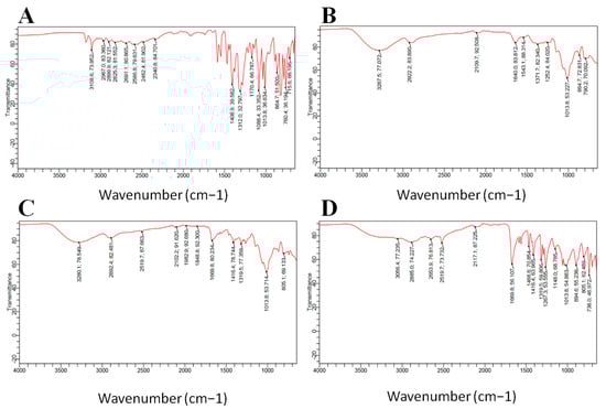 FTIR spectra of MCZ (A), XGM (B), TXGM (C) and nanoparticles of NTG1 (D).