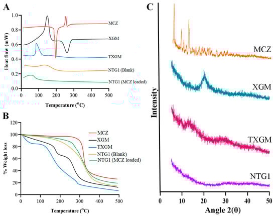 DSC (A) and TGA (B) of MCZ, XGM, TXGM, blank and MCZ-loaded NTG1 formulation of nanoparticles and XRD (C) of MCZ, XGM, TXGM and NTG1 formulation.
