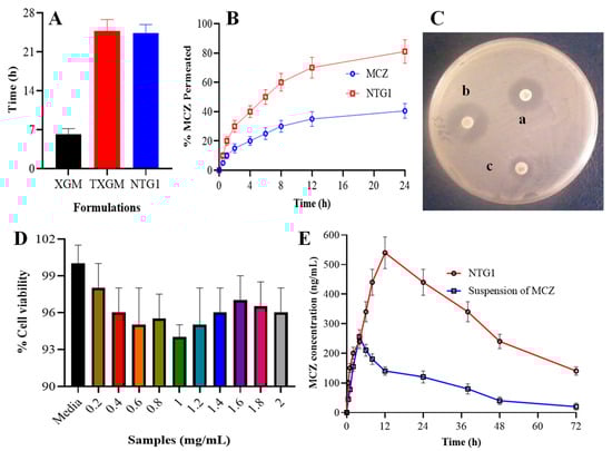 Mucoadhesion of thiolated polymers with nanoparticles of TXGM (A), permeation of MCZ from pure MCZ and nanoparticles of NTG1 (B), antifungal activity of NTG1 and pure MCZ (C), cell viability assay using different concentrations of nanoparticles of NTG1 on Caco-2 cells (D) and pharmacokinetics of MCZ from NTG1 and suspension of MCZ (n = 6) (E). In part (C), a, b and c are the zones of inhibition of MCZ gel, NTG1 and control group, respectively.