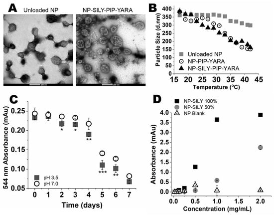 Characterization, stability, and collagen binding of pNIPAM nanoparticles modified with SILY: (A) TEM micrograph of unloaded and drug-loaded pNIPAM nanoparticles modified with SILY, scale bar = 200 nm. The nanoparticles were lyophilized and resuspended in Milli-Q water for 4 h at 25 °C prior to TEM. Scale bar = 200 nm. (B) Dynamic light scattering for the hydrodynamic diameter temperature sweep from 17 °C to 42 °C of unloaded NPs and NPs and NP-SILY loaded with piplartine and YARA. (C) Degradation of fluorescently labeled nanoparticles over 7 days of dialysis against 1× PBS pH 7.4 and 3.5 at 544 nm of absorbance. * p < 0.05, ** p < 0.001, and *** p < 0.0001 against pH 7.0. Data are the mean ± standard deviation of 6 replicates. (D) Collagen-binding assay demonstrating the ability of NP-SILY to bind to a collagen-I-coated surface. Particle binding increased with an increase in conjugated SILY, whereas blank nanoparticles did not show the ability to bind to the collagen plate.