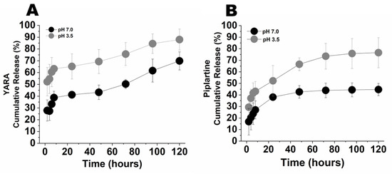Release profiles of YARA (A) and piplartine (B) incorporated in NP-SILY in PBS at pH 3.5 and pH 7.4 over 120 h at 37 °C. Bars represent the average ± SEM (n = 12).