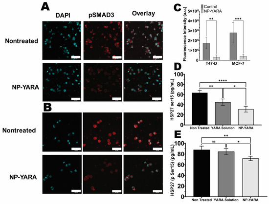 MCF-7 (A) and T47-D (B) cell staining for Smad3 (pSpS423/425). Cells were treated with 10 ng/mL TGF-beta for 1 h before treatment with the nanoparticles containing YARA (NP-YARA). Nontreated cells were used as a control. As a secondary antibody, Alexa Fluor® 488 (Red) was used. Nuclei were stained with DAPI (Blue). The confocal images were captured at 60× magnification. Scale bar: 50 µm. (C) Quantification of the mean fluorescence intensity was by Fiji ImageJ2 software, and data are shown as the average ± standard deviation of 9 replicates in 3 independent experiments. Phosphorylation of HSP27 Serine 15 treated with YARA solution or NP-YARA for 48 h and compared with nontreated cells (positive control) in (D) MCF-7 and (E) T47-D cells. Error bars represent the standard deviation. * p < 0.05 ** p < 0.01, *** p < 0.001, and **** p < 0.0001, ns = non-significant compared to the control.