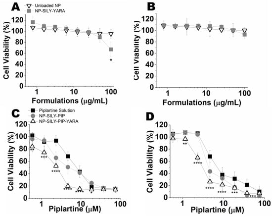 Viability of breast cancer cells after exposure to the unloaded nanoparticles and nanoparticles loaded with YARA, piplartine, or piplartine + YARA for 72 h: (A) comparison of the treatment of T47-D cells with unloaded (Unloaded NPs) or YARA-loaded nanoparticles (NP-SILY-YARA); (B) comparison of the treatment of MCF-7 cells with unloaded (Unloaded NPs) or YARA-loaded nanoparticles (NP-SILY-YARA); (C) comparison of the treatment of T47-D cells with piplartine solution and nanoparticles loaded with piplartine (NP-SILY-PIP) or piplartine+ YARA (NP-SILY-PIP_YARA); (D) comparison of the treatment of MCF-7 cells with piplartine solution and nanoparticles loaded with piplartine or piplartine + YARA. Data are shown as the average ± standard deviation of 10–15 replicates in 4–5 independent experiments. * p < 0.05, ** p < 0.01, *** p < 0.001 and **** p < 0.0001 compared to unloaded nanoparticles.