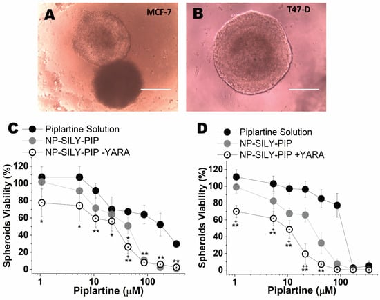 Formation and viability of spheroids after treatment with the nanoparticles. Sizes of MCF-7 (A) and T47-D (B) spheroids after 5 days in culture. Bar = 400 µm. Viability of the MCF-7 (C) and T47-D (D) spheroids after exposure to the drug solution in DMSO or to the nanoparticles with encapsulated piplartine or piplartine + YARA for 72 h. Data are shown as the average ± standard deviation of 12 spheroids in 4 independent experiments. * p < 0.05, ** p < 0.01 compared to the piplartine solution (DMSO) and + p < 0.05, ++ p < 0.01 compared to NP-SILY-PIP.