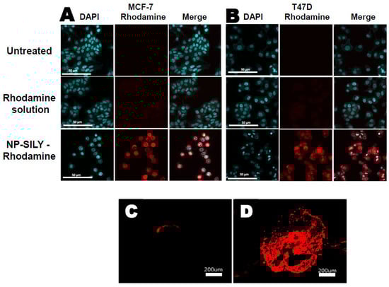 A monolayer of MCF-7 and T47-D and spheroids of T47-D cultures were incubated for 48 h with Rhodamine B labeled nanoparticles (NP-SILY-Rhodamine) at 50 μg/mL (0.1 μM), DMSO Rhodamine B solution (0.1 μM), or DMSO as a negative control (untreated). Monolayer culture was washed 3 times with 1× PBS and fixed with 4% paraformaldehyde for 30 min. Nuclei were stained with 4,6-diamidino-2-phenylindole (DAPI; Sigma-Aldrich), and cells were visualized using confocal microscopy at 64× [47,49]. Before cryosectioning, spheroids were fixed for 30 min with 4% paraformaldehyde, washed 3 times with 1× PBS, and frozen at −80 °C in Tissue-Tek O.C.T. Samples were sectioned at a thickness of 10 μm using a cryo-microtome [50]. Then, fluorescent images were obtained to identify nanoparticles that target cells in the inner area of the tumor spheroid.