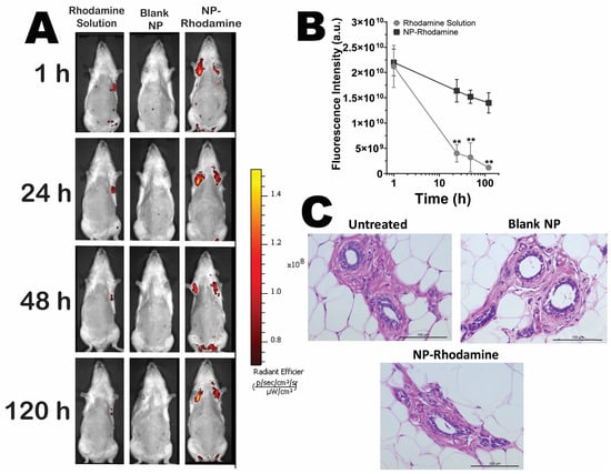 In subsequent studies, the nanocarriers were evaluated for their ability to promote in vivo localization of fluorescent markers and induce histological changes in mammary tissue. Figure 7A shows representative images of animals subjected to intraductal administration of blank NPs (nonlabeled NPs), rhodamine-labeled nanoparticles, or rhodamine solution. Upon intraductal administration, the fluorescent marker solution demonstrated immediate drug distribution within the mammary tissue, comparable to that of NP-Rhodamine within the first hour. However, this initial localization was not sustained; fluorescence signals experienced a statistically significant attenuation (p < 0.01) after 24 h, indicating a rapid decline in the marker’s presence. Conversely, NP-Rhodamine exhibited a more durable localization, with detectable fluorescence persisting for up to 120 h postadministration, as evidenced in Figure 7A. This sustained visibility suggests that NP-Rhodamine provided a more stable retention profile for the therapeutic agent within the mammary tissue.
