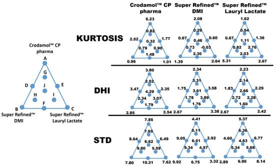 | Point | Ord. | Crodamol™ CP Pharma (X1, % w/w) | Super Refined™ DMI (X2, % w/w) | Super Refined™ Lauryl Lactate (X3, % w/w) | STD Crodamol™ CP Pharma (Y1) | STD Super Refined™ DMI (Y2) | STD Super Refined™ Lauryl Lactate (Y3) |
