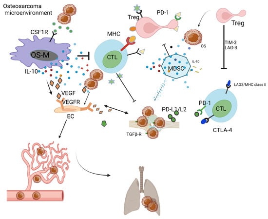 Osteosarcoma is known for its high heterogenicity and low tumor immunogenicity. The extensive immune cell infiltration in the OS-TME leads to the formation of a niche for OS proliferation, metastasis, and resistance [17,49]. This immunosuppressive OS-TME is correlated with the presence of MDSCs (Myeloid-Derived Suppressor Cells), OS-Ms (osteosarcoma-associated macrophages), ECs (endothelial cells), and Tregs (regulatory T lymphocytes) [50]. Among them, MDSCs are a heterogeneous population of immune cells that play a crucial role in suppressing the anti-tumor immune response [51]. OS-M refers to tumor promoting macrophages, which, in general, contribute to tumor progression via promoting angiogenesis, tissue remodeling, and immunosuppression. ECs (endothelial cells) are responsible for the supply of nutrients [52,53]. Regulatory T lymphocytes (Tregs) is beneficial for the immune surveillance [19].