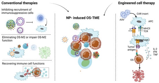 Traditional intervention approaches, such as surgical resection and chemotherapy, are primary strategies against OS. Cancer immunotherapy has surfaced as an important avenue for the improvement in OS-TME, benefiting the inhibition of metastasis and recurrence of OS [20]. For the therapy associated with the OS-M, we divided current immunotherapy for regulating the OS-M into two types: conventional immunotherapeutic and novel engineered cell therapy [21,22]. The conventional approaches encompass the inhibition of recruitment of tumor-promoting OS-M, the impairment of OS-M, and the recovery of OS-M phagocytosis function [23]. Nanotechnology is a significant platform for the therapeutics of modulating the OS-TME. Nanoparticles offer multiple advantages, including the ability to be intricately engineered for the robust and precise activation of T cells before their adoptive transfer [24]. Additionally, Nps can be used to provide the added functionality of immunotherapy [25,26]. Thus, nanoparticles present a promising solution to address the challenges associated with T cell therapy [27,28]. To enhance the accumulation of therapeutics at tumor sites, it is crucial for nanocarriers (NCs) to exhibit prolonged circulation, a characteristic achievable through surface modification with hydrophilic polymers like polyethylene glycol (PEGylation) [29]. Additionally, nanoparticles can also encapsulate agents with a size range of 50–100 nm and can effectively enter parenchymal hepatic cells, stimulating T cell activity [30]. Nanocarriers with a size less than 50 nm can penetrate the cellular barriers, promoting nanoparticle distribution into the bone lesion [31].
