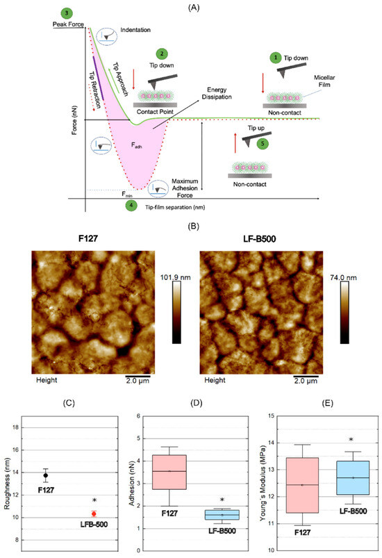 (A) Schematic diagram of a typical force versus separation curve obtained with AFM. (B) Topographic maps of the nanostructured micelles. (C) Root mean square of the roughness plot. The values found for the empty F127 micelles (F127). Significant value differences were determined by ANOVA statistics with post-test Tukey p < 0.05. (D) Graph of adhesion forces with mean values of 3.5 ± 0.9 nN and 1.6 ± 0.3 nN, respectively, for F127 and LF-B500. The inner image represents the behavior of the AFM probe during the film interaction in the analysis of adhesion forces. (E) Young’s modulus plot with mean values of 12.4 ± 1.4 MPa for the F127 and 12.8 ± 1.0 MPa for the LF-B500. The inner image represents the behavior of the AFM probe during the film interaction in the analysis of elastic forces. (*) Values with a significant difference in the ANOVA statistics with post-test Tukey p < 0.05.