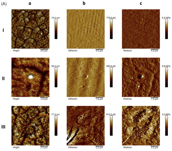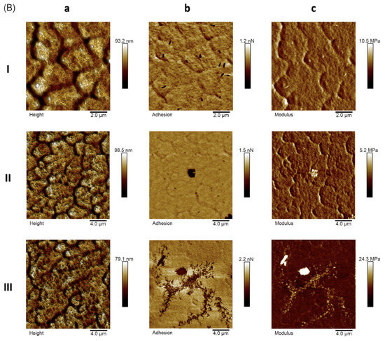 AFM representative images for (A) empty F127 micelles and (B) BRA-loaded F127 micelles: height (aI–aIII), adhesion force maps (bI–bIII), and Young’s modulus (cI–cIII).