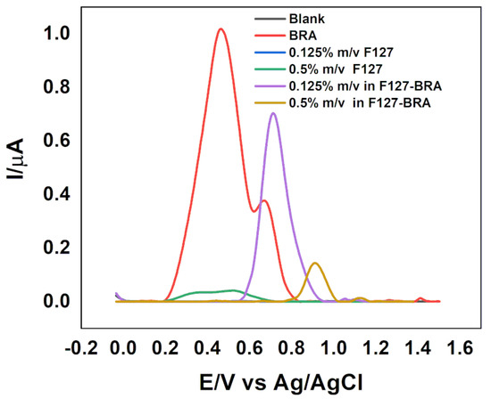 Electrochemical techniques are potentially useful tools used in the understanding of mechanisms, detection, characterization, and evaluation of antioxidant activity in plant extracts or synthesized samples, allowing us to relate their structure-activity with the effect on oxidation potential. In this context, BRA, F127, and Bra-loaded F127 micelles were studied. Figure 4 shows differential pulse voltammograms in the absence (Blank) and presence of BRA, F127, and BRA-loaded F127 micelles. In Blank, no Faradaic process is observed. For BRA, three main oxidation peaks were observed, according to the literature [47]; BRA-A presents a peak oxidation potential of around +0.48, while BRA-B and BRA-C present the oxidation process, the +0.71 and +0.57 V vs. Ag/AgCl, respectively.