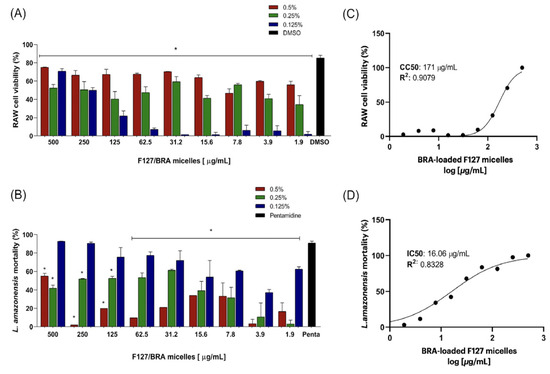 In vitro cytotoxicity assay of BRA-loaded F127 micelles against (A) RAW 264.7 cell line murine and (B) Leishmania amazonensis promastigotes. The assay was performed for different F127 copolymer concentrations (w/v): 0.5% (red bars), 0.25% (green bars), and 0.125% (blue bars), scanning a BRA concentration range of 500 to 1.9 µg/mL. The dose–response curves were accessed by linear regression for 0.125% w/v of the F127 copolymer. (C) 50% of RAW cell proliferation was achieved for a BRA concentration of 171 µg/mL, and (D) 50% of Leishmania amazonensis promastigotes proliferation was achieved for a BRA concentration of 16.06 µg/mL. The results correspond to (means ± SD) of individual samples tested in triplicate. (*) p < 0.05, compared to the positive controls (DMSO and pentamidine).