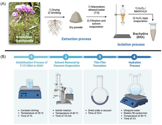 Schematic experimental steps for (A) extraction and isolation of BRA from Arrabidaea brachypoda roots and (B) preparation of BRA-loaded F127 micelles by the solid dispersion method.