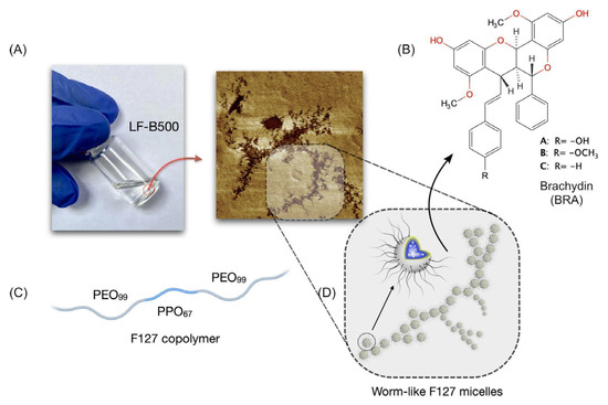 (A) Picture of the liquid formulation LF-B500 showing physical stability after 72 h of preparation. (B) Chemical structure of brachy-dins A, B, and C. (C) Representation of the F127 copolymer composition. (D) Schematic representation of worm-like F127 micelles observed by morphology analysis.