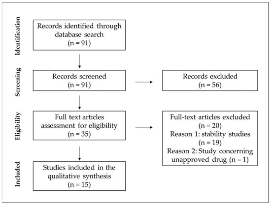 The research methodology of this study involved searching data based on six different configurations of three-keyword-based sets. The keyword sequence used to search the database was the following: “parenteral nutrition” and “compatibility” or “Y-site” and “neonatal” or “neonates” or “pediatric” or “paediatric”. Figure 1 presents the flow diagram of the search methodology.