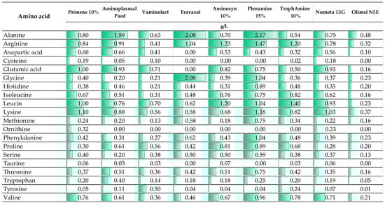 The special nutritional requirements of newborns and children who differ from adults have necessitated the development of PN ingredients dedicated to this special group of patients. Generally, infants and young children have higher protein requirements per unit of body weight compared to adults due to the period of rapid growth and tissue development in their bodies. The adequate supply of essential amino acids, including histidine, isoleucine, leucine, lysine, methionine, phenylalanine, threonine, tryptophan, and valine, play a crucial role in their growth and development, and, as such, should be provided in proper amounts within PN. Moreover, some children and infants, especially preterm infants, due to illness or immaturity (this applies to premature infants), are unable to sufficiently, endogenously synthesize some essential amino acids, which in this condition become essential (conditionally essential). This concerns cysteine, tyrosine, glycine, arginine, proline, asparagine, and glutamine [31]. Nevertheless, the conditional indispensability of some of these amino acids is discussed [32,33]. Currently, few pediatric formulations of amino acid solutions are available on the market. In Figure 2, a comparison of the amino acid compositions of different products and their indications is provided.