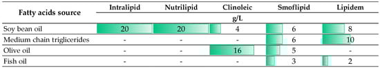 Since there are multiple ways of providing PN therapy, in the literature concerning Y-site compatibility, PN is defined in various ways, either as 2-in-1 PN in the form of solution or as 3-in-1 PN admixture in the form of lipid emulsion. Lipid emulsion is a critical component of PN. It is prone to many destabilization factors. Due to their ability to neutralize repellent electrostatic interactions between lipid droplets, exposure to acidic conditions, especially at pH below 5.5, and high concentrations of calcium and magnesium ions are the main known destabilizers of lipid emulsions [41]. Infusing unstable lipid emulsions separately or as an ingredient of a PN with droplets that exceed the internal diameter of the pulmonary microvasculature increases the risk of embolic syndrome [42]. As shown in several studies, the type of lipid emulsion can affect compatibility [43,44,45]. This is a result of different oil compositions between preparations and, in some cases, various types or concentrations of excipients. A comparison of intravenous lipid emulsions used to prepare neonatal or pediatric PN is shown in Figure 3.
