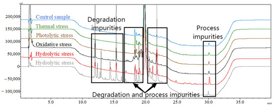 The HPLC chromatograms in Figure 5 depict the impurity profiles resulting from different forced degradation conditions, illustrating variations in impurity levels.