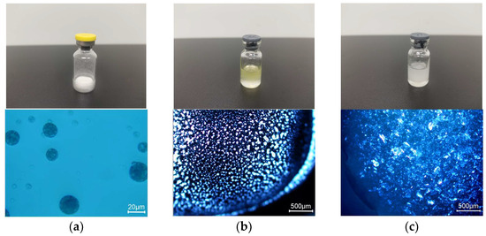 Visual appearance and polarizing microscope observation of three formulations: (a) microspheres (F1); (b) phospholipid-based in situ gel (F2); (c) PLGA-based in situ gel (F3).