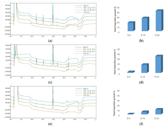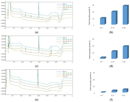 The typical HPLC chromatograms (left: a,c,e; the X-axis represents the time, and the Y-axis represents the signal intensity) and the impurity profile charts (right: b,d,f) of the updated impurity profile for different formulations. The typical chromatograms (left: a,c,e): blue—Day 0; green—Day 10 @ 40 °C, brown—Day 20 @ 40 °C; olive—placebo (formulation without ACTY116); (a,b) microspheres (F4); (c,d) phospholipid-based in situ gel (F5); (e,f) PLGA-based in situ gel (F6).