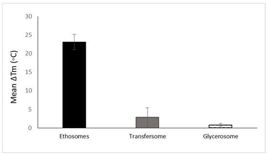 The development of soft vesicles presents an interesting evolution of phospholipid vesicles. This type of nanovesicle is obtained owing to the presence of solvents such as alcohols. The first and most investigated soft vesicle is the ethosome, introduced by Touitou [12]. This nanovesicular carrier is composed of phospholipid, ethanol (20–50% w/w) with or without glycols, water, and the active molecule. Generally, ethosomes are multilamellar nanovesicles containing bilayers from wall to wall. The ethosomal phospholipid vesicles contain short-chain alcohols like ethanol or isopropyl alcohol with an optional addition of glycols such as Transcutol® or propylene glycol. Phosphorous (31P) NMR data indicated that the high alcohol concentration in ethosomes imparts fluidity to the phospholipid bilayers and organizes them in a spherical lamellar-closed shape. This notable fluidity of the lipid bilayers in ethosomal vesicles, compared to liposome, was further confirmed by the results of fluorescent anisotropy measurements of 9-antrivinyl labeled analogue of PC (AVPC) and differential scanning calorimetry (DSC) data. A reduction of up to 30 °C was reported in the main Tm of the phospholipid in ethosomal nanovesicles when compared with the corresponding liposomes [11]. The changes in the Tm values ethosomes and other phospholipid nanovesicles are presented in Figure 3.