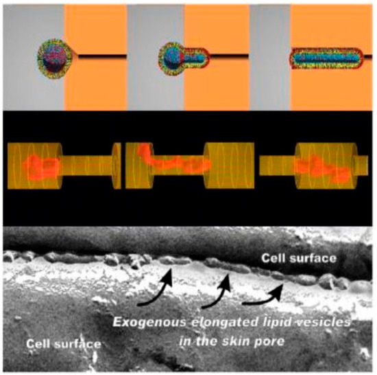 Proposed mechanism of skin penetration by transfersomes. (Top): computer-simulated distribution of more (red, e.g., a surfactant) or less (blue, e.g., a phospholipid) water-soluble molecules with hydrophobic (yellow) chains arranged in a mixed amphipathic spherical bilayer as a function of predefined vesicle shape. (Middle): a simulation of a highly deformable, infinitely permeable, non-destructible vesicle forced by a horizontal gradient into a pore with 0.5 smaller diameters. (Bottom): an electromicrograph of elongated, deformable vesicles in an inter-corneocyte water-filled channel within the human stratum corneum following the application of a lipid preparation on its open surface. Reproduced from Reference [37] with permission.