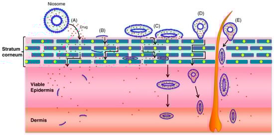 Proposed mechanisms of action of niosomes for dermal and transdermal applications: (A) drug molecules are released by niosomes; (B) niosome constituents act as penetration enhancers; (C) niosome adsorption and/or fusion with Stratum Corneum; (D) intact niosome penetration through the intact skin; (E) niosome penetration through hair follicles and/or pilosebaceous units. Reproduced from [9] with permission.