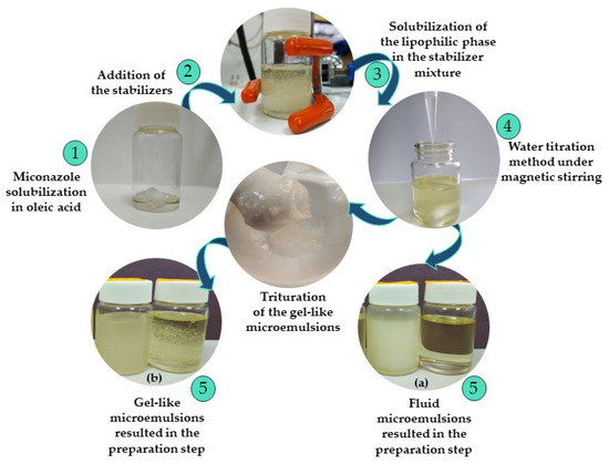 Essential steps followed in the preparation process of the microemulsions with miconazole, consisting in 1— drug solubilization in the oil phase, 2—addition of the stabilizers, 3—lipophilic mixture solubilization with the stabilizer phase under continuous stirring, 4—application of water titration under stirring resulting in two types of systems: 5 (a)—fluid microemulsions, and 5 (b) —gel-like microemulsions, previously triturated to uniformize their consistency.