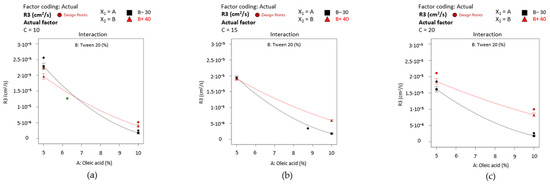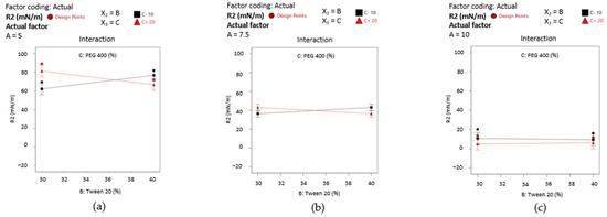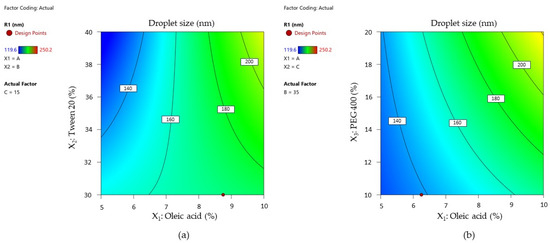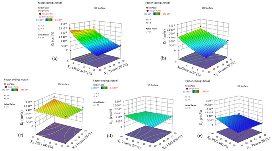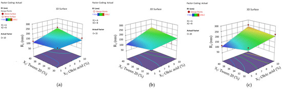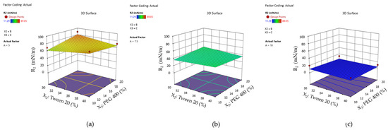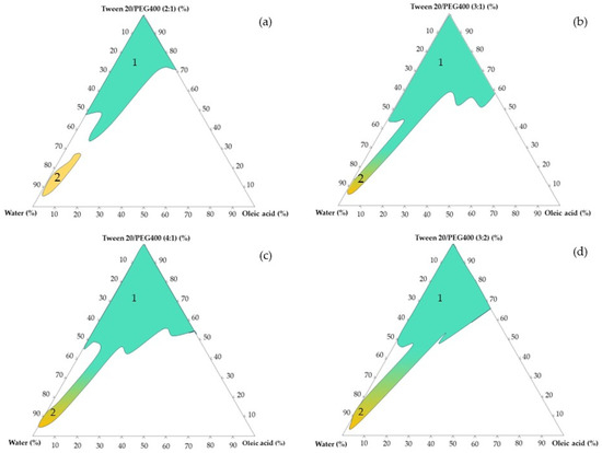 It was concluded that microemulsions could be adequately obtained if the Tween 20/PEG 400 ratio is selected in a ratio of 3:1 or 4:1, as represented in Figure 3—cases (b) and (c). The area of microemulsions was represented with a green color, while the yellow-like area was defined as a particular area of nanoemulsions. As the ratio of Tween 20/PEG 400 is modified through 2:1 and 3:2, the area of stability becomes narrowed, especially in the case of the O/W systems. At the same time, the unstable area was wider in the two last cases. Tween 20 significantly contributed to an enlargement of the microemulsion area. The method was considered useful to appreciate potential domains of stable microemulsions that can be proposed and studied using a factorial model.