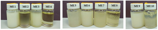 The microemulsions coded ME 1–ME 10 visualized after preparation at room temperature, 24 ± 0.5 °C.