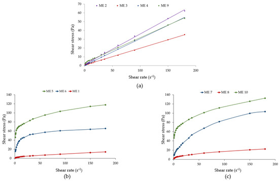 The flow behavior of the microemulsions was tested at 37 ± 0.5 °C using a Lamy RM100 CP2000 Plus rheometer equipped with a cone-plate stage (Lamy Rheology Instruments, Champagne au Mont d’Or, France) [66]. The cone-plate coded CP6020 was used, and the measurements were performed by applying 17 rotational speeds from 0.3 rpm to 60 rpm. Shear rate (s−1), shear stress (Pa), and viscosity (Pa·s) were recorded, and the flow behavior was described using mathematical modeling.