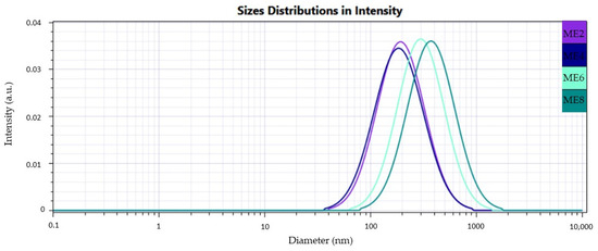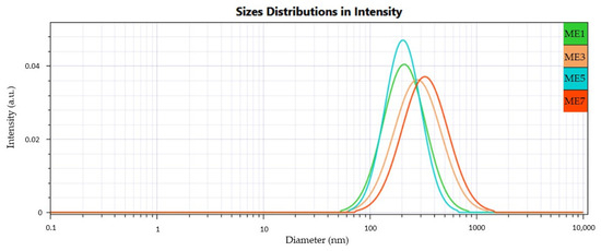 The droplet size profiles projected using the Cumulant model were visualized comparatively to find homogeneous systems with a narrower domain of droplet dimensions, with peaks displaced through a 100 nm size zone.