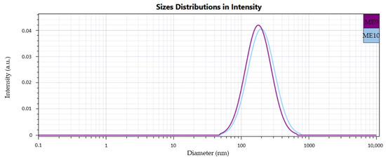 Conductivity analysis was performed to confirm the O/W type of the microemulsions [85]. The results obtained and presented in Table 6 showed a conductivity variation between 7.92 ± 0.02 and 101.90 ± 0.66 μS/cm, where the maximum value was specific for the microemulsions with the highest water level of 53%. Furthermore, by increasing Tween 20 from 30% to 40% or PEG 400 from 10% to 20%, conductivity decreased to 47.60 ± 0.10 μS/cm and was well visualized for the ME 1–ME 4 group. With the addition of the oil phase in the maximum concentration of 10%, a strong effect can be observed, attaining minimum values around 8 μS/cm, specific for ME 7, its replications, and ME 8. In the case of ME 9 and ME 10, intermediary results were obtained.